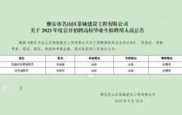 雅安市名山區(qū)茶城建設工程有限公司系雅安市名山區(qū)區(qū)屬一級國有企業(yè),成立于2018年,注冊資本2億元,主要經(jīng)營范圍為對土地、城市資源等領域及保障性住房、房地產(chǎn)開發(fā)、城市基礎設施、公共服務設施等進行經(jīng)營管理;并開展項目投資、工程管理服務及園林綠化、環(huán)境治理、土地整理等各類工程建設活動。根據(jù)公司2022年人員招聘計劃,茶城公司及全資子公司擬面向社會公開招聘高校畢業(yè)生3名(含2020年、2021年未就業(yè)高校畢業(yè)生和2022年應屆高校畢業(yè)生。特別說明:“未就業(yè)高校畢業(yè)生”需同時滿足以下條件:拿到畢業(yè)證和學位證;在規(guī)定擇業(yè)期內(nèi)沒有與任何單位簽訂任何形式的勞動合同...