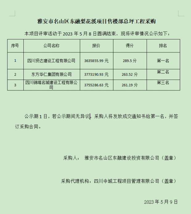 雅安市名山區(qū)東融梨花溪項目售樓部總坪工程采購